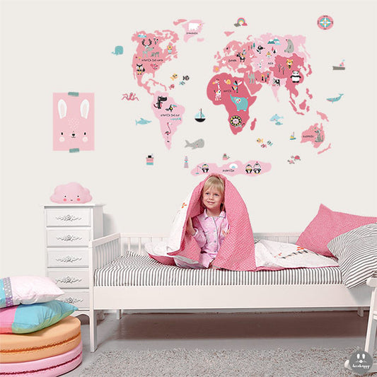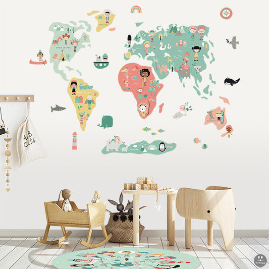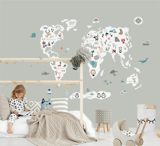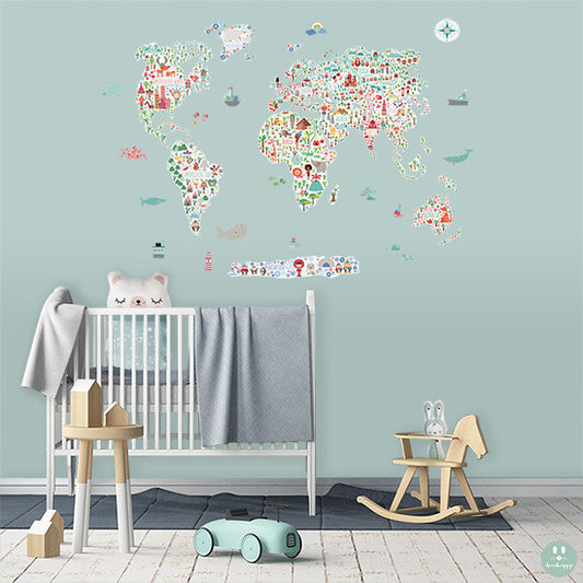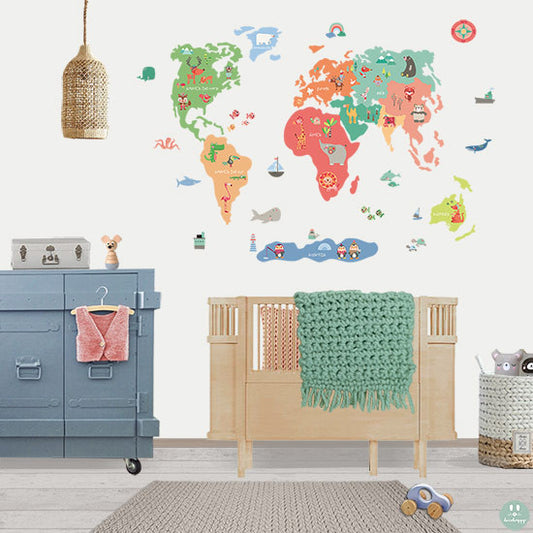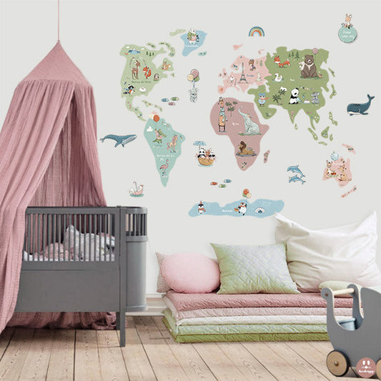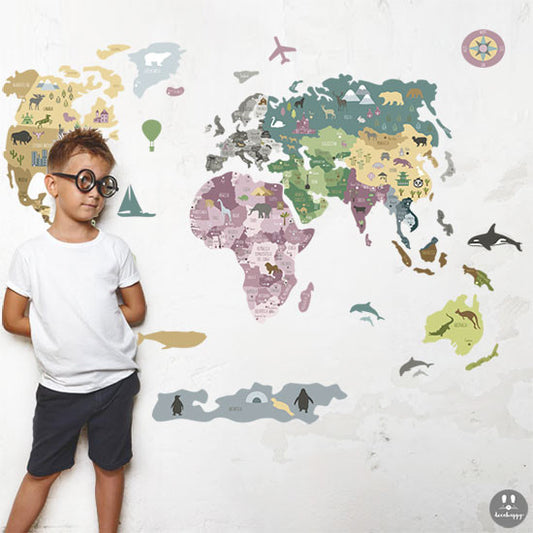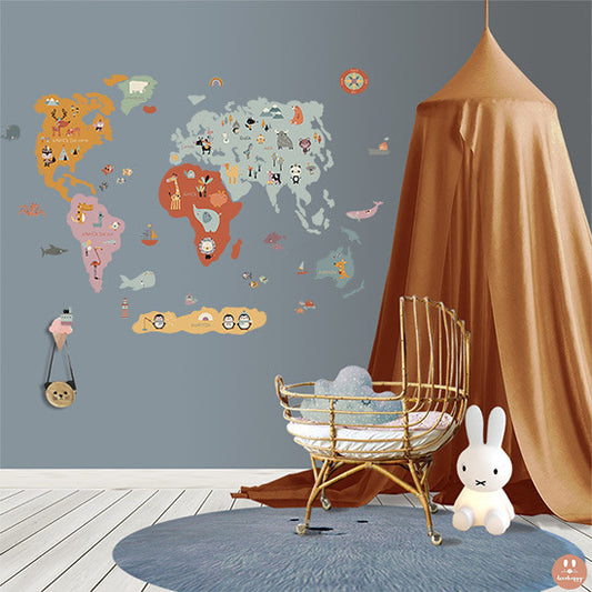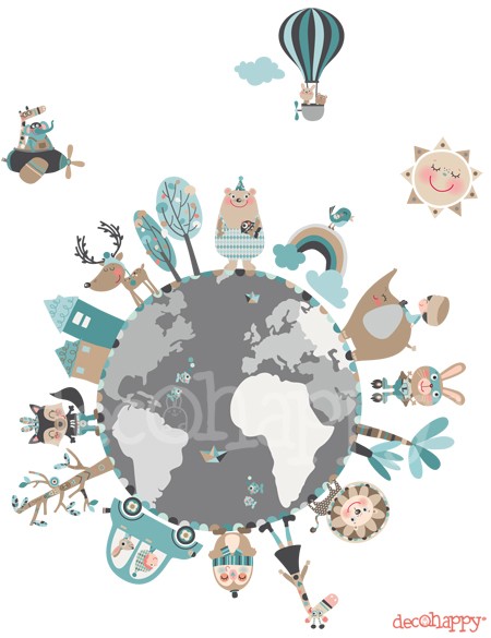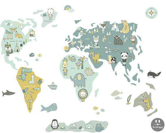 Vinilo infantil de tela Mapamundi Animal colores vintage