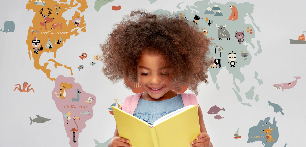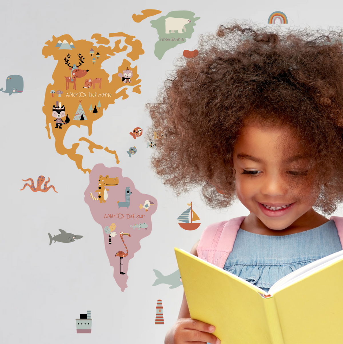 Adesive murali bambini in tessuto Mappamondo Etnie colori