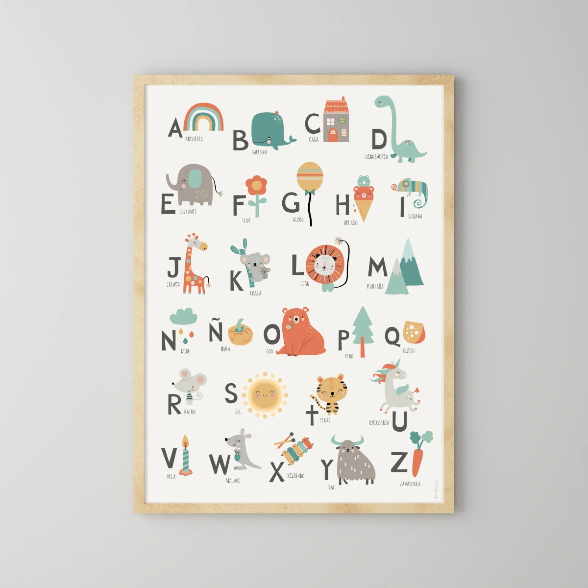 Didáctica y decorativa lámina infantil Abc happy llena de personajes felices dispuestos a enseñar jugando a tu peque el abecedario !!