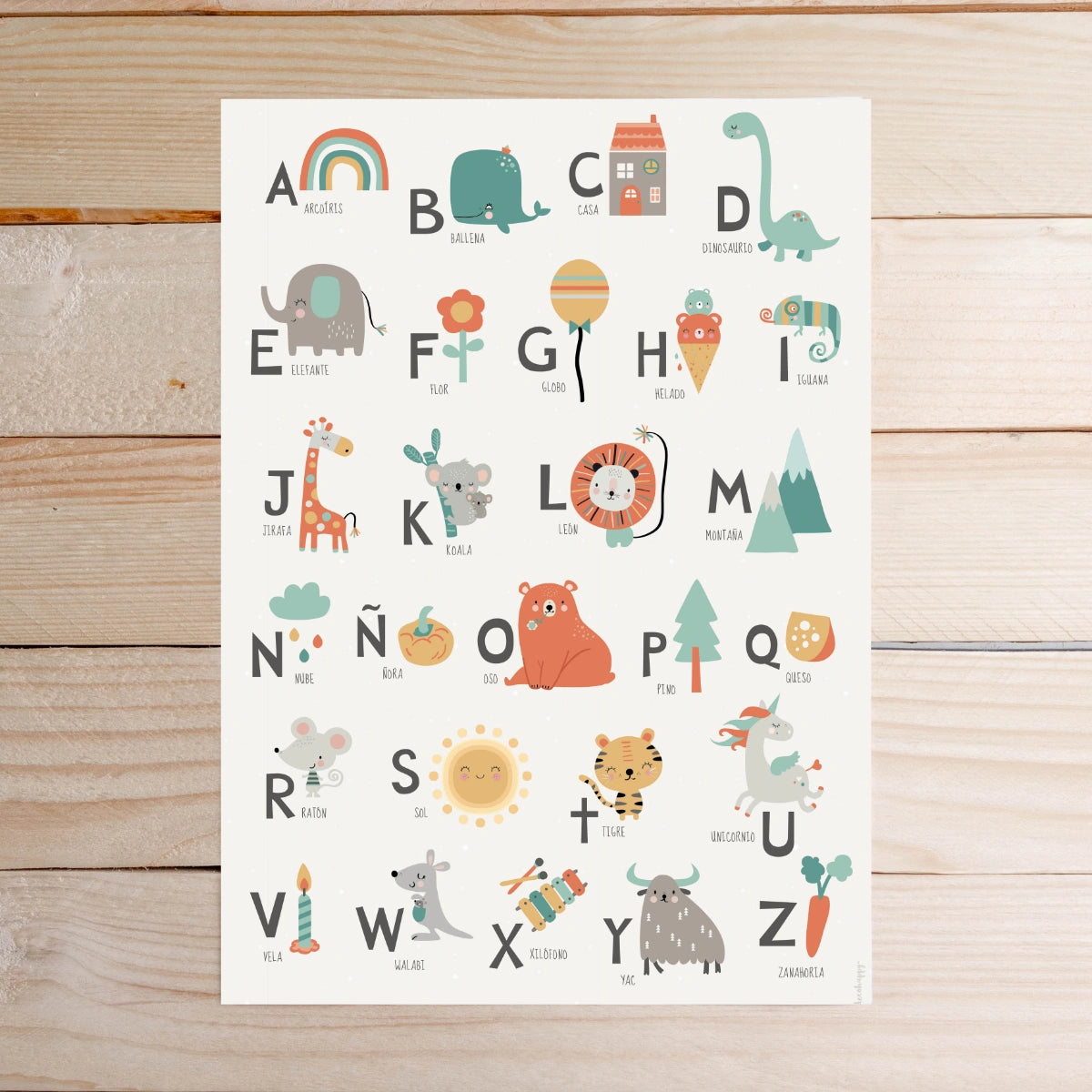 Lámina infantil mapamundi diseñada e ilustrada con todo detalle con personajes alegres para enseñar a tu peque todas las letras del abecedario y decorar su habitación.