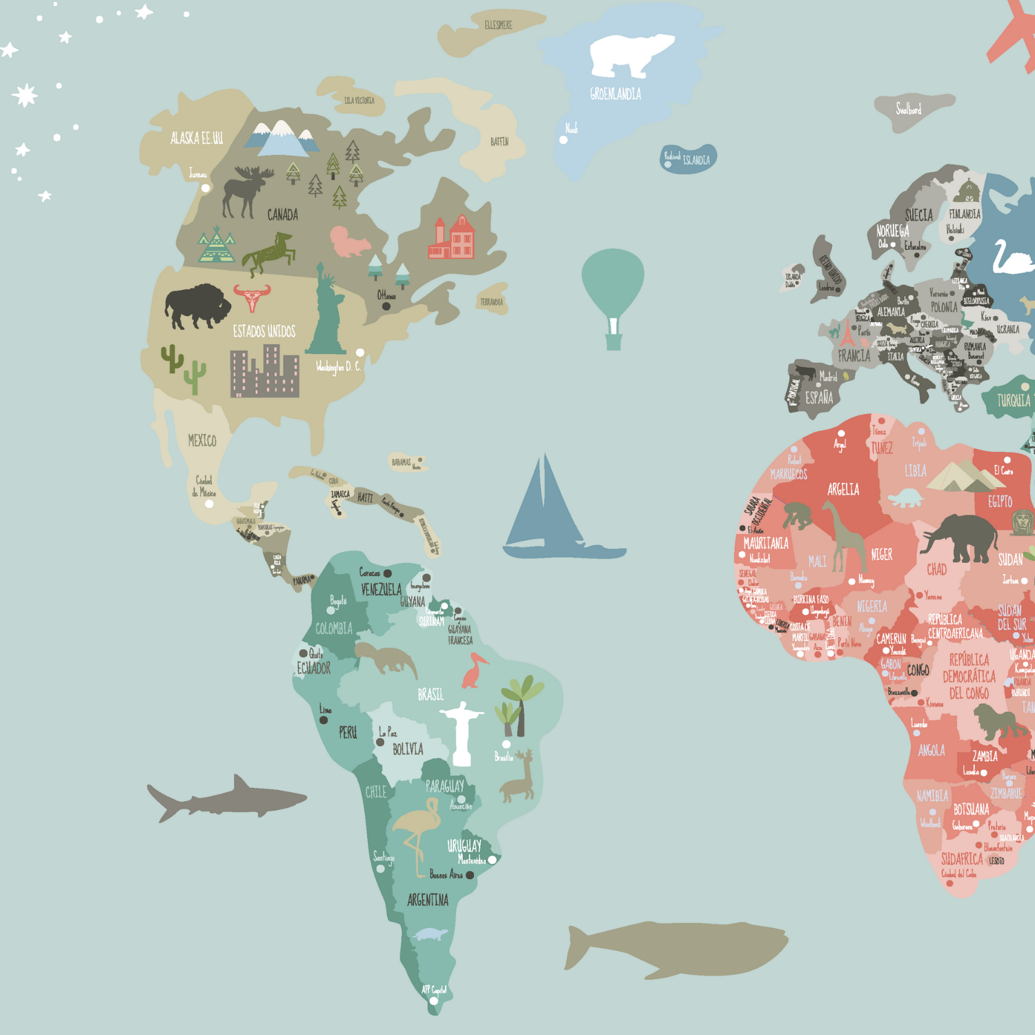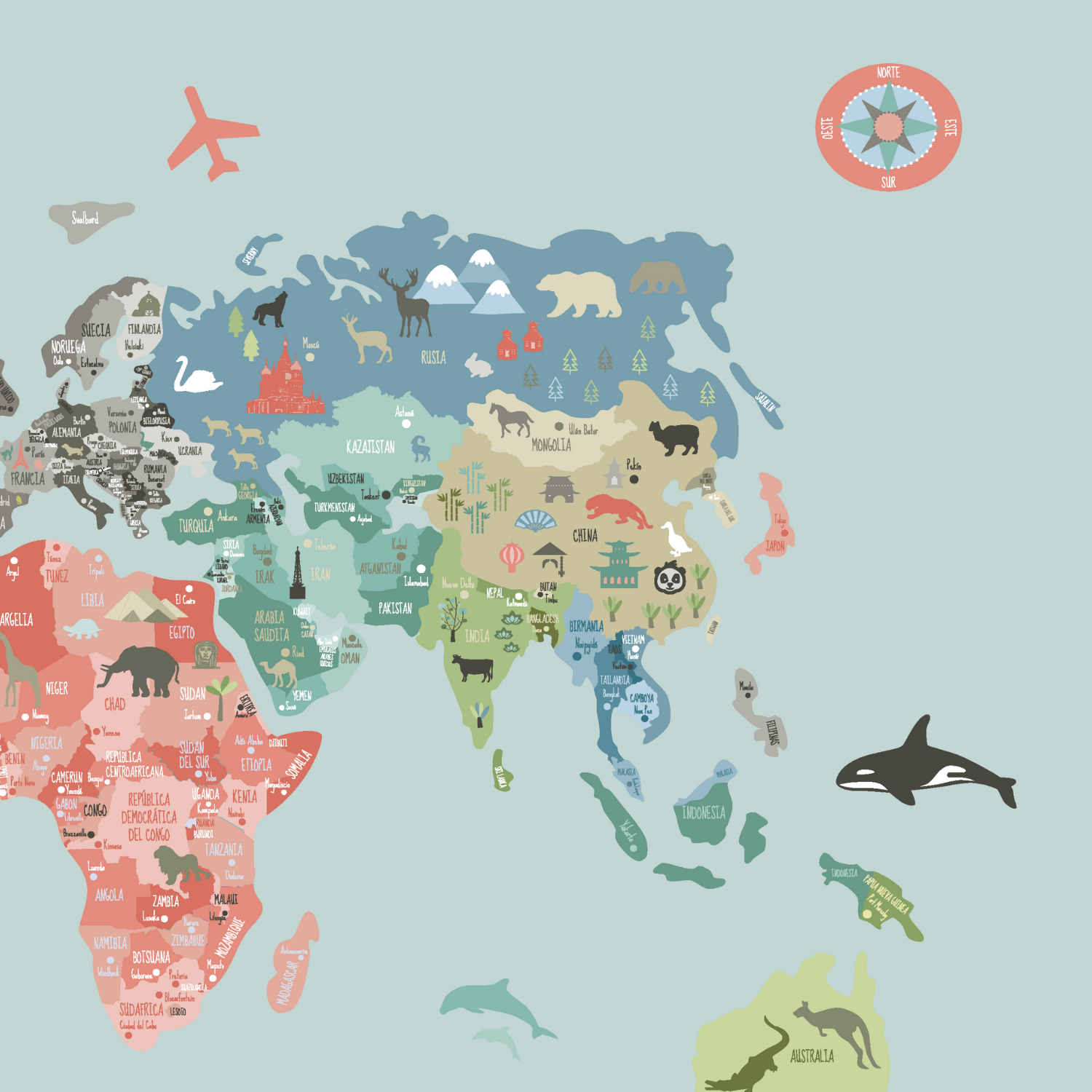 Una forma visual y atractiva de aprender geografía: continentes, países y océanos representados de manera clara para despertar la curiosidad natural de los peques.