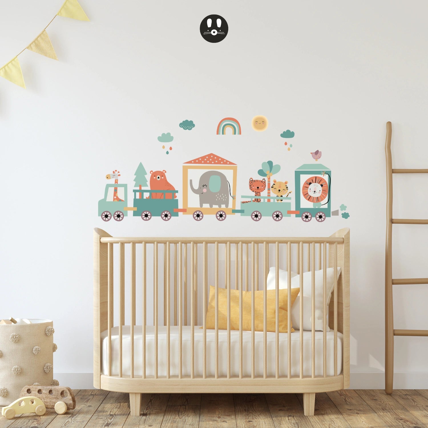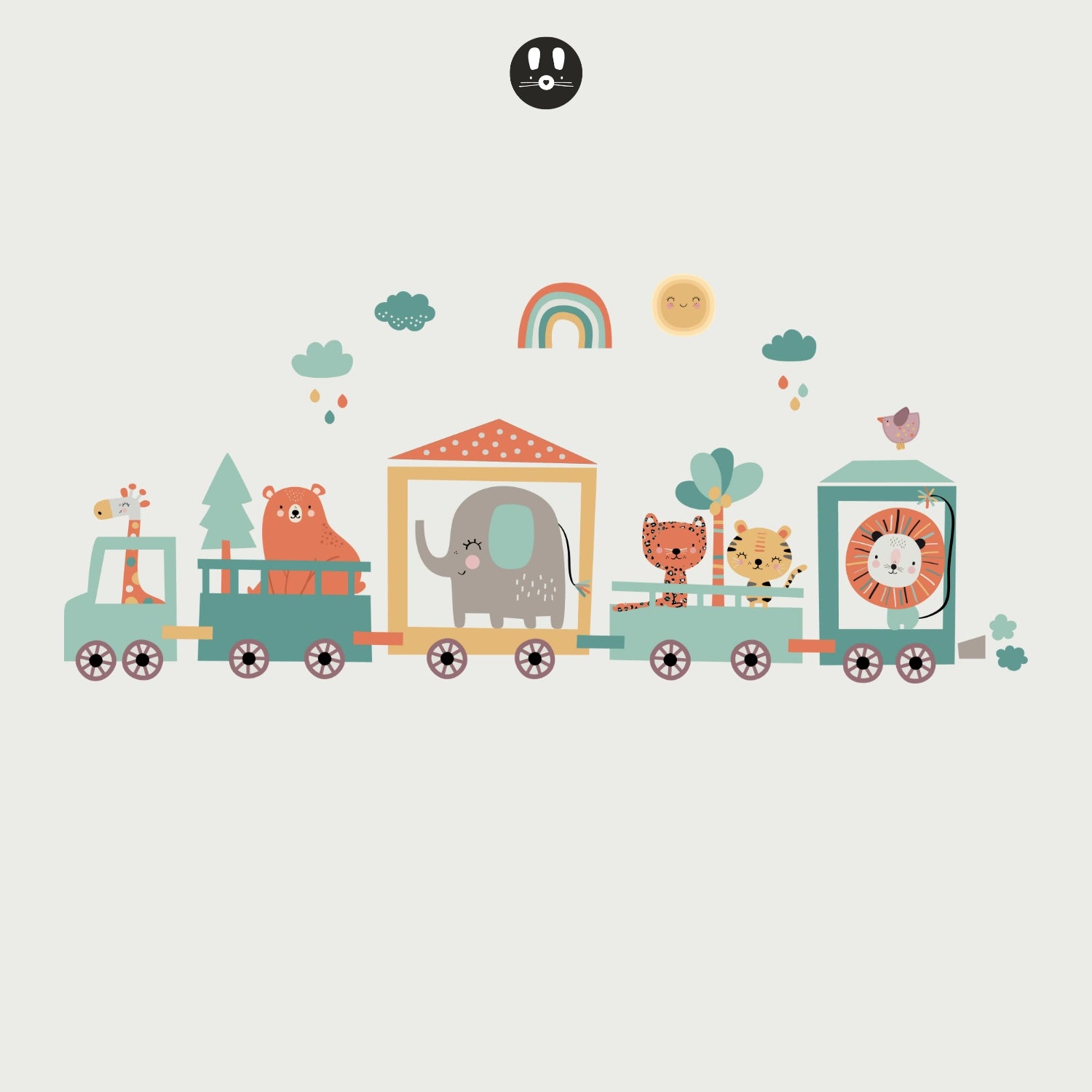 Vinilo infantil con un tren muy chulo que conduce la jirafa y lleva a su destino el cuarto de tu peque al elefante, al tigre, al leopardo, al oso, al león y a un pajarito que se ha apuntado con su arcoíris, nubes y sol.